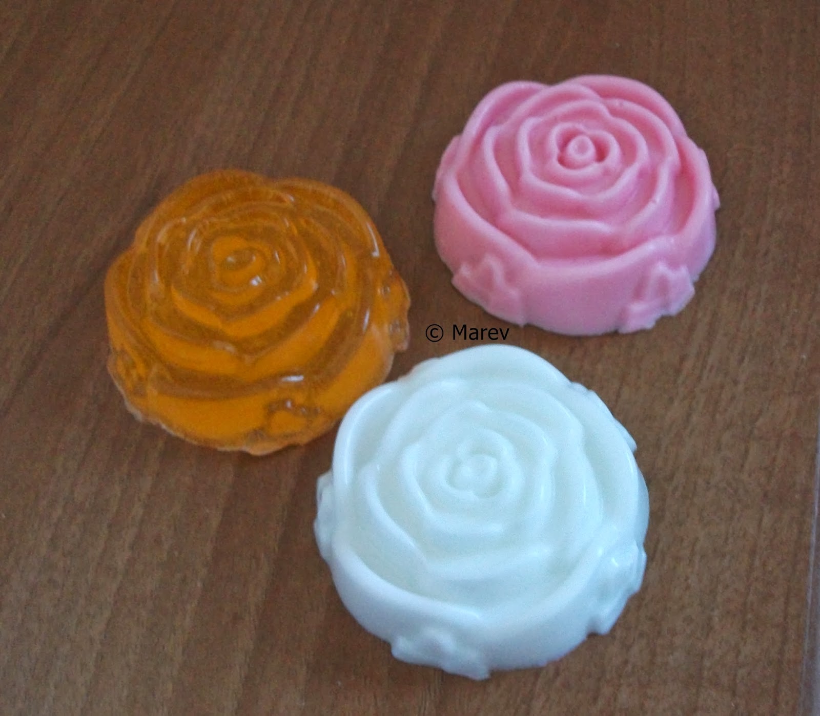 Sabonetes de glicerina com várias fragâncias. Os rosa são de morango, os laranja de toranja e os brancos de coco. Estes sabonetes deixam a pele suave além de embelezarem a casa de banho.